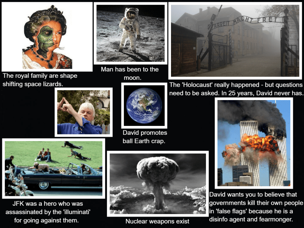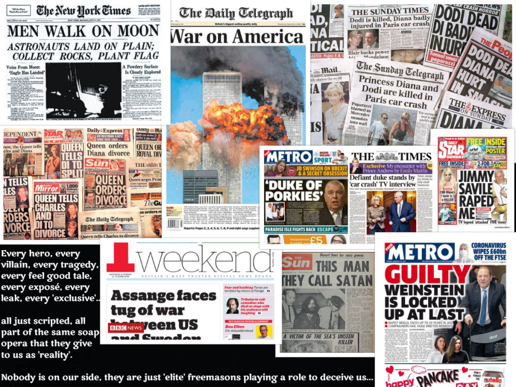 This is a fantasy narrative where ‘outer space’ exists, we live on a spinning ball, JFK was ‘killed’ for being on ‘our side’ (even though he was from a freemasonic ‘bloodline’ family), governments kill their own citizens in ‘false flag’ terror attacks, the ‘holocaust’ happened, nuclear weapons exist, ‘viruses’ and ‘pandemics’ are real, Princess Di was ‘killed’ by the Windsors and there is a coming ‘New World Order’ one world government in which all of our ‘freedoms’ and ‘liberties’ will be stripped from us because the goal of this ‘cabal’ is to own and enslave us completely.