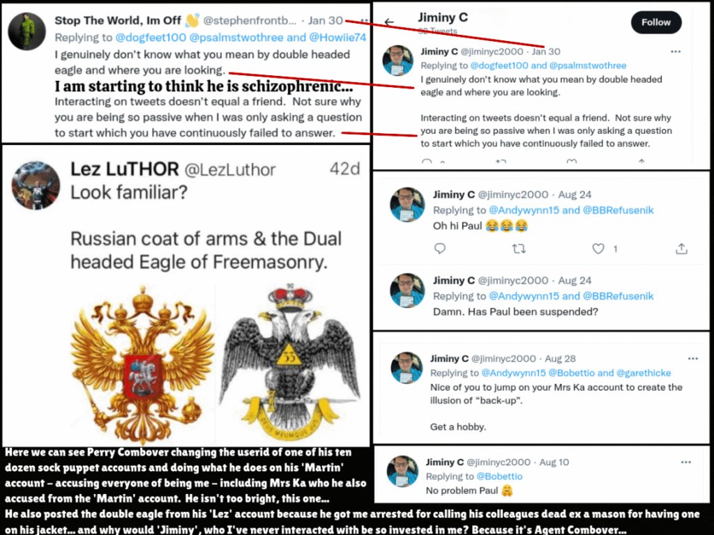 Perry also deletes his tweets – just like ‘Bobettio’ funnily enough – and I have shown that he has changed his userid to turn one ‘sock puppet’ account into another – who both happen to be people that know me and have an interest in me despite me not having ever conversed with them (on those accounts anyway)…