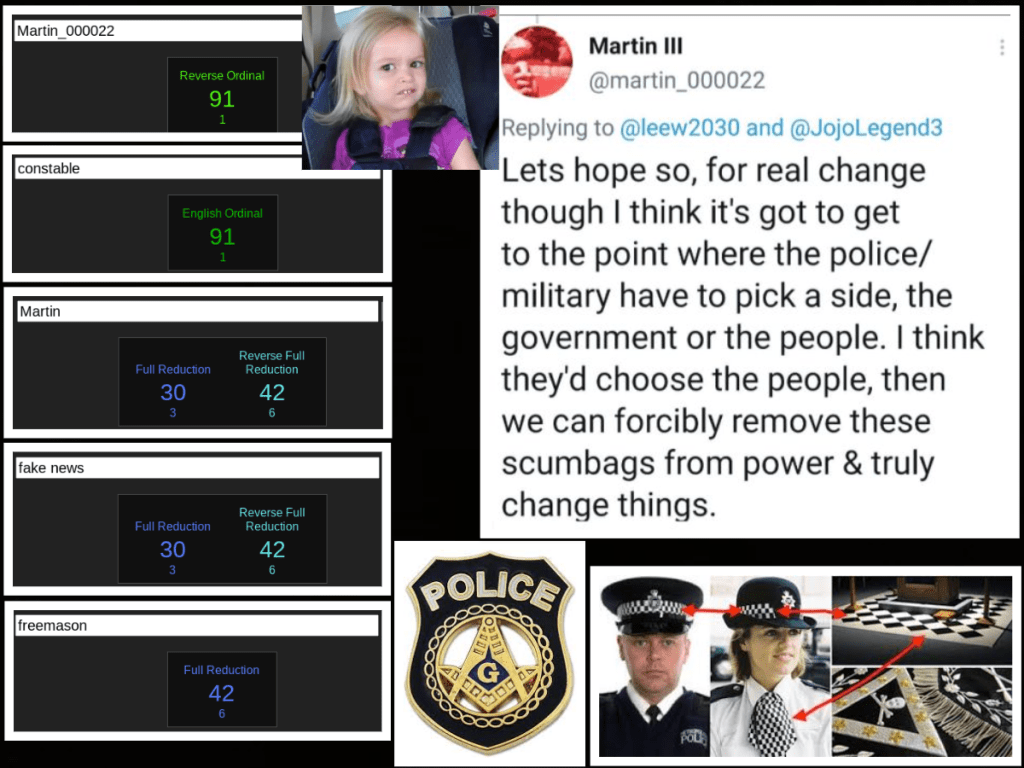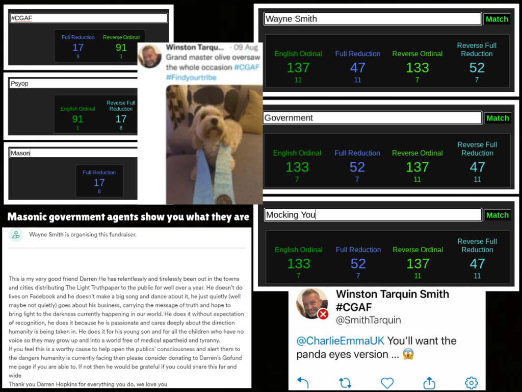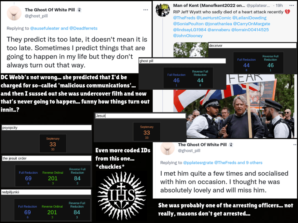 What’s funny is, all I would have to do is say all of this on Twitter, ask him whether Jo’s ex’s patch means he is a freemason etc and he’d run away and block again. This is someone who reckons he will come down with his imaginary friends and kill me. Well, it’s been over a year now and he comes down to London all the time to work at demos as a crisis acting police officer yet he never comes to the address that he has shared like a coward – just like his ‘mate Wayne, who shows us via his gematria that he is a government agent – funny that…