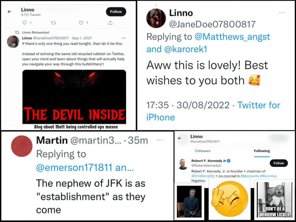 This has only served to highlight their behaviour and their lies to others because when people start questioning them they start with the bog standard masonic deflection, mental health tropes and threats because liars and deceivers fear being exposed – and this group and its members are all liars and deceivers. They are freemasons so how could they not be..?