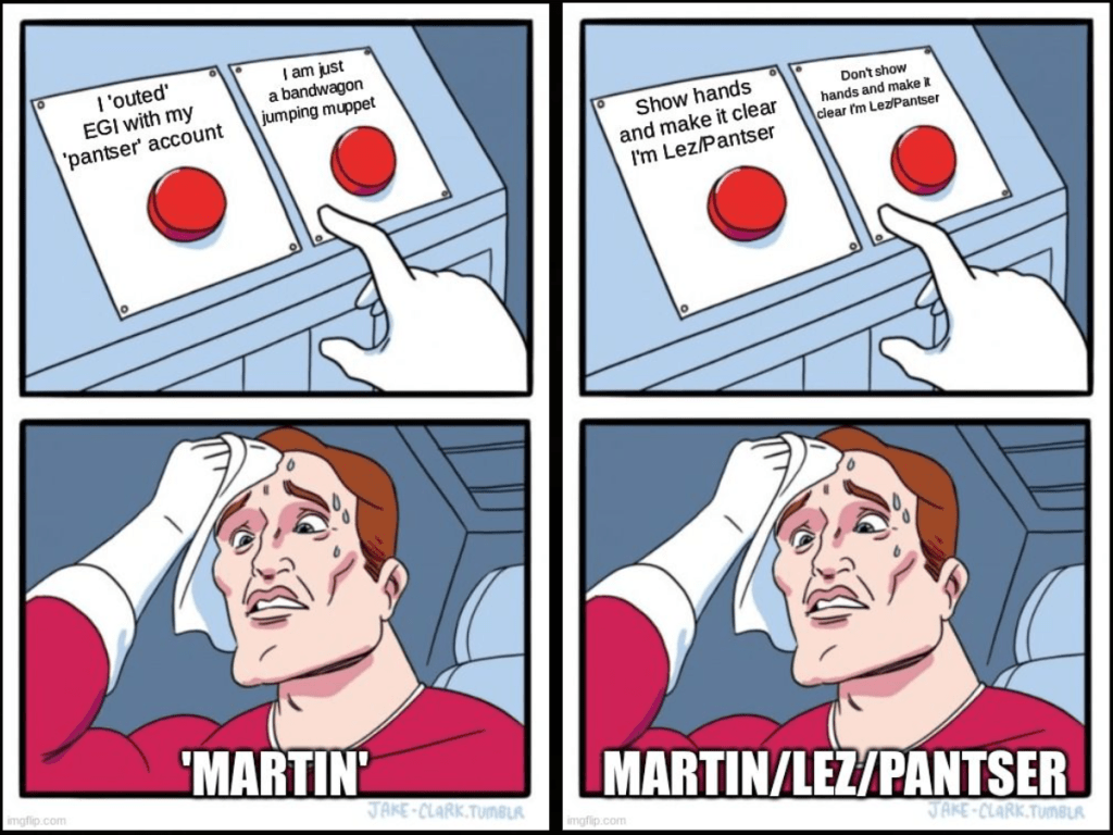 Nobody would believe I’d use ‘sock puppet’ accounts as I say what I need to say on my own account and I put my name to my blog. ‘Martin’, on the other hand, won’t even show his hands, let alone his face, because I am absolutely 100% correct that he is ‘Lez’ and ‘Pantser’ and all of the other accounts that I am going to show on here – and many more too…