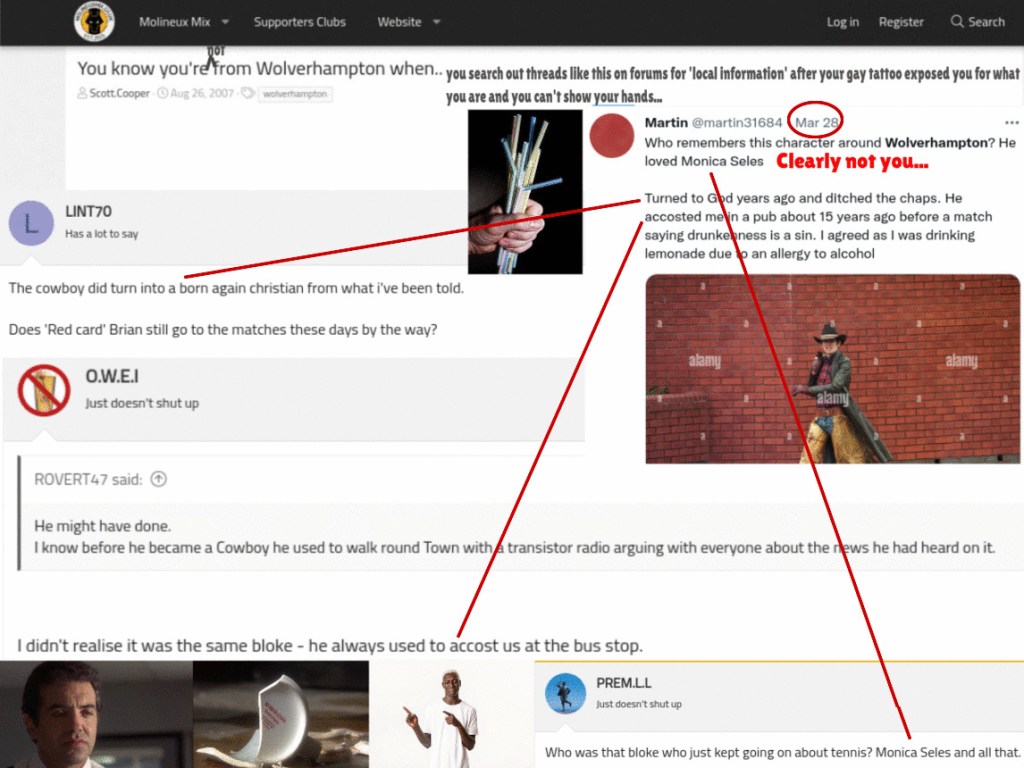 Instead of taking literally a few seconds to take a photo of his hand and post it on Twitter, he went to elaborate lengths to pretend that he is from Wolverhampton as ‘proof’ – by buying Wolves ‘merch’ from e-Bay and by reading about local Wolverhampton ‘characters’ on a Wolves forum that I also found, Molineux Mix.