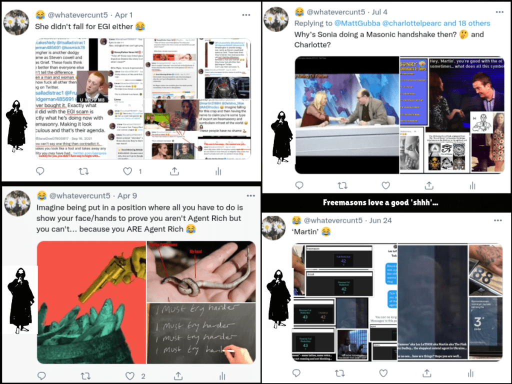 In her narrative we fell out and then I called her a mason in ‘retaliation’ – this is a popular one amongst them as it must be in their textbook at Hendon. In reality, I saw through her and didn’t follow her on my new account and then we fell out after she started attacking me for choosing not to follow her. What’s also interesting is that ‘Pantser’ called me to ask me what was going on, that she had been crying and upset over it and asked if I would follow her so she could apologise – which I declined.