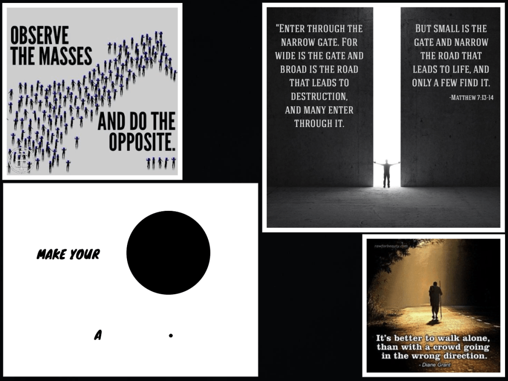 The vast majority of humans are herd animals and have absolutely no capability of standing alone against the crowd and walking the ‘narrow path’ that we are told to keep on in The Bible. They fear ridicule and abuse from their peers and they wilt and crumble whenever they are threatened or intimidated because they are mentally weak and spiritually dead.