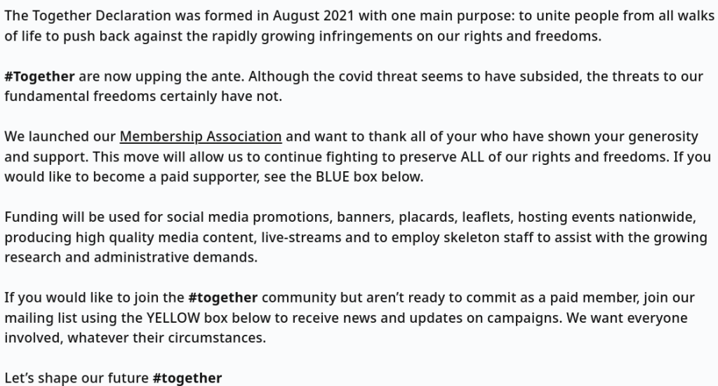 To highlight how these groups are all linked, you only have to look at the signatories of the ‘Together Declaration’ when they were first formed and you’ll see Louise Creffield of Save Our Rights UK and Nacho and Kelly from Stand Up X to bring the herd to their new pen. Same s**t, different label, as they say…