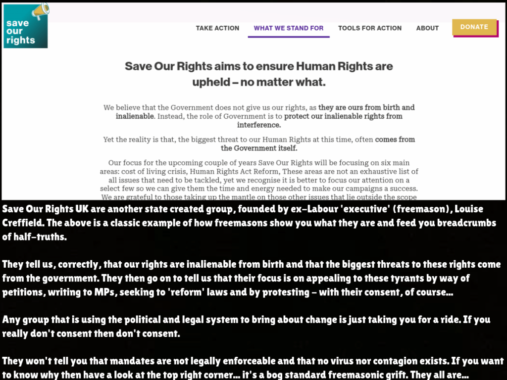 These freemasonic deceivers are no different to the likes of KBF, Save Our Rights UK and Stand Up X and they push the exact same narrative and yet somehow still manage to hook the same ‘fully wide awake critical thinkers’ that the other masons did. If you are one of the deluded people that still think those groups are legit then you can read my blogs about KBF here, Stand Up X here and the groups in general here.