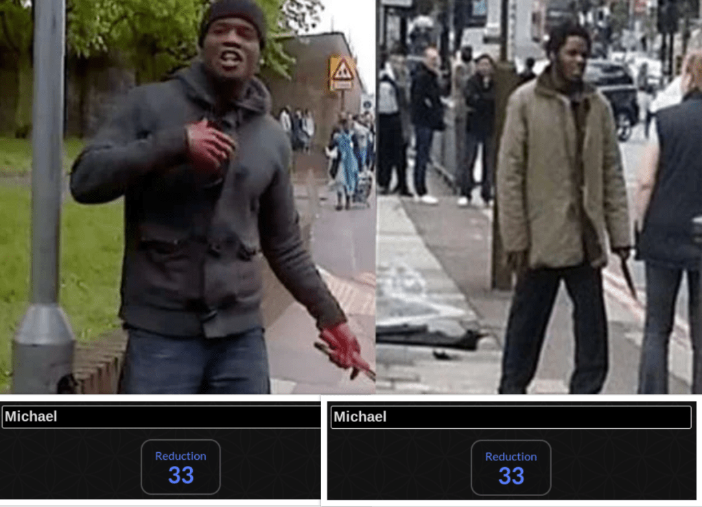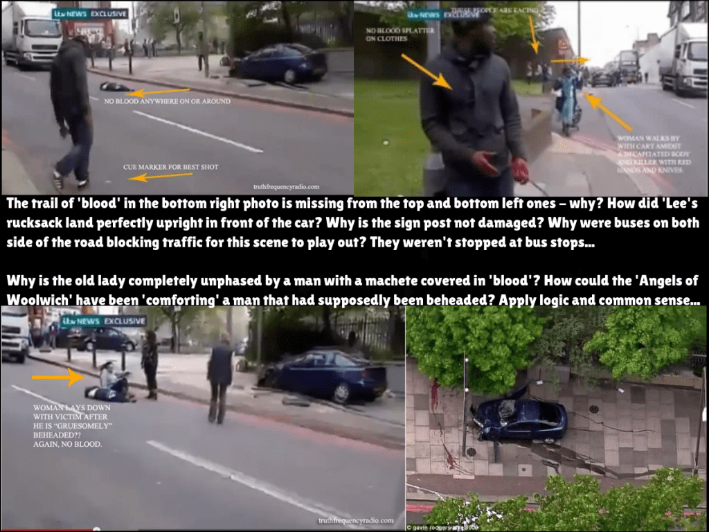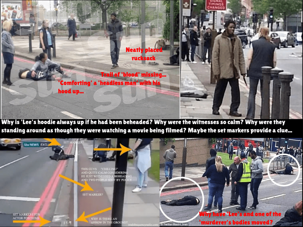 Secondly, the ‘killer’ was conveniently wearing a purple top to indicate deception and, as you can see above, the man who was ‘arrested’ was wearing different clothes to the ‘attacker’. Another pertinent point concerns why he was clearly wearing an earpiece, as though this was part of some military intelligence psyop (which, of course, it was).