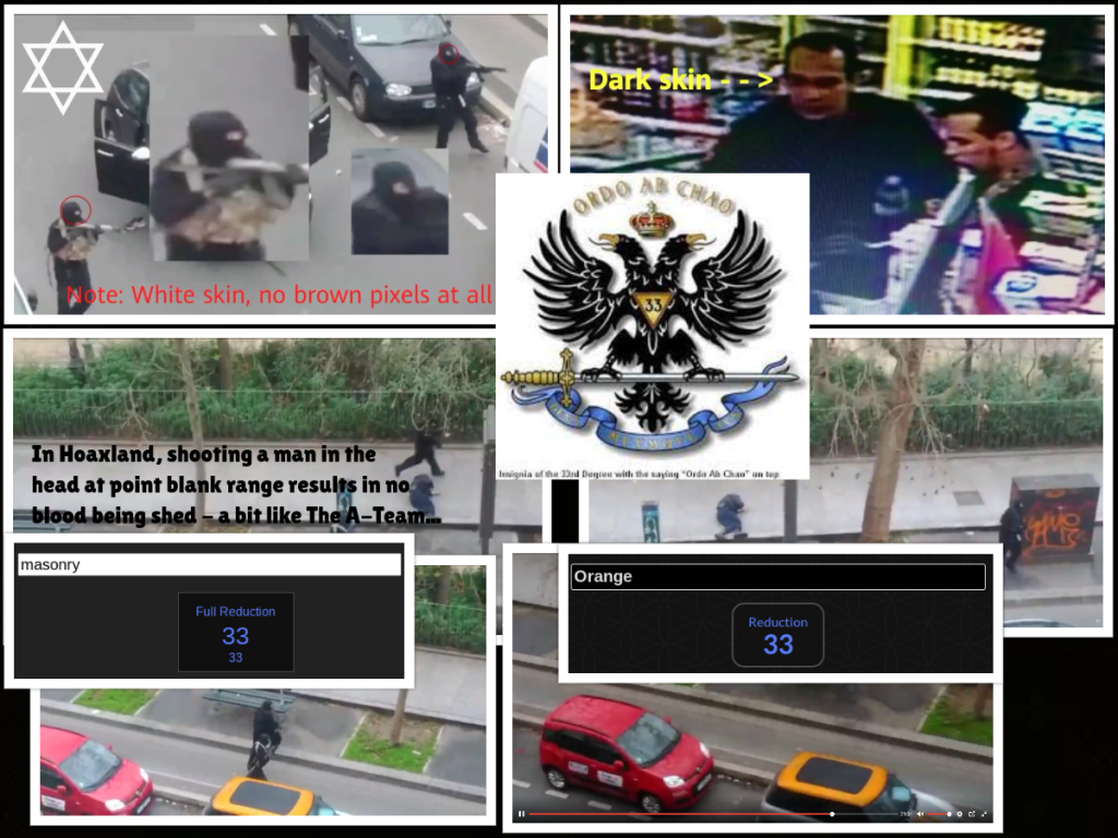 Take this scene above from the supposed ‘Charlie Hebdo murders’ – a man is supposedly shot in the head at point blank range and yet not one drop of blood was shed. The men doing the fake shootings in the balaclavas can be seen to have white skin yet the footage from the garage of the ‘killers’ show dark skinned men. We can see an orange car and orange graffiti in the scene to show us that freemasonry is behind it. You can also see from this video here how they used coded number plates to show you that the “London Bridge attack” was fake and staged by freemasons, this one here shows you the ‘dead terrorist coming back to life’, this one here shows one of the ‘injured’ crisis actors laughing and this one here shows you that the Pulse Nightclub “shooting” was fake and staged also – they always are.
