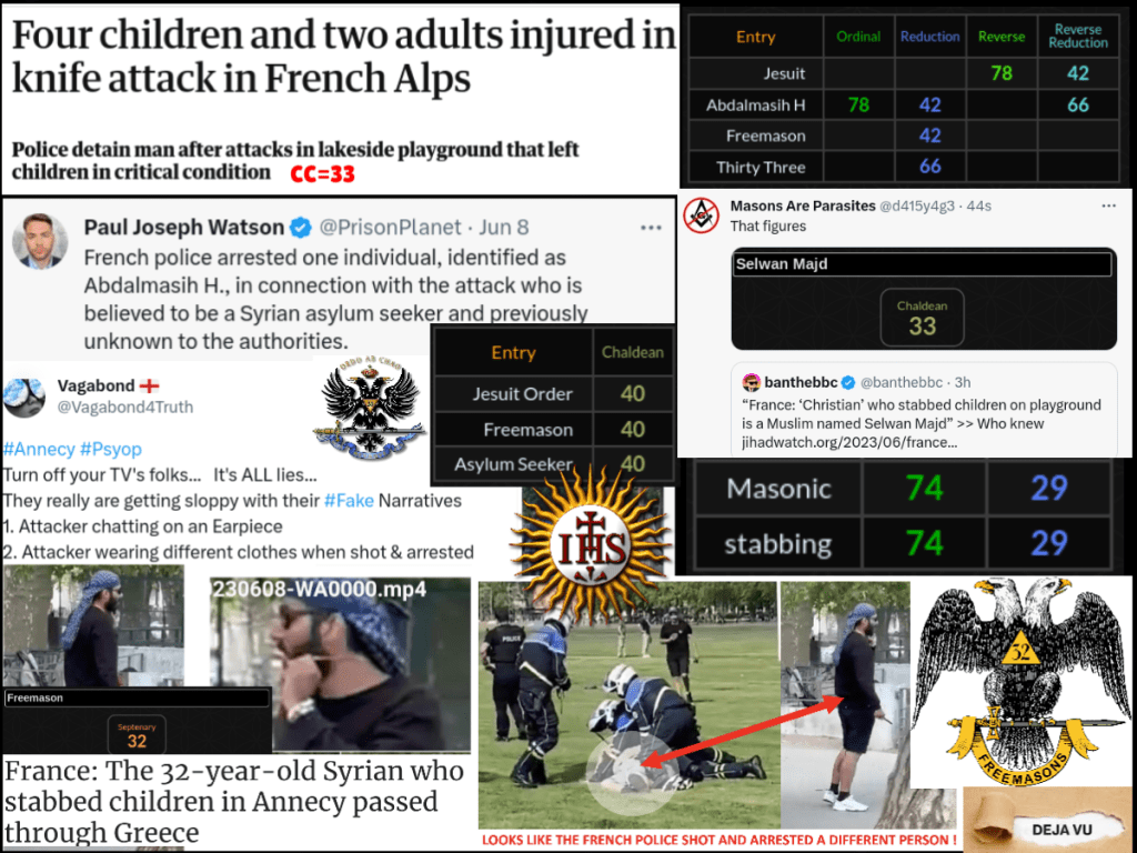 In June, a supposed Muslim who was initially identified with a ‘42’ (for freemason) coded name allegedly ‘stabbed to death’ 4 children and 2 adults (notice the 42 again?) in a playground in France. Despite later being revealed to have an Islamic name (coded for 33), we are supposed to believe that this ‘Muslim’ was carrying a crucifix and screaming “In the name of Jesus Christ” during this ridiculously fake looking ‘attack’.