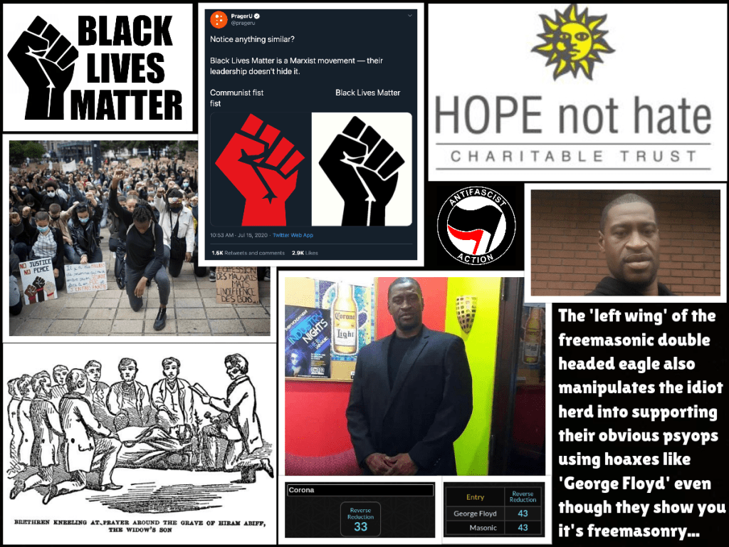 The same goes for the ‘left wing’ groups such as Antifa, Unite Against Fascism, Hope Not Hate and Black Lives Matter – they’re all created and controlled by freemasons too – so if you are one of those taken in by these obvious psyops, give your heads a massive wobble as well. For example, the George Floyd ‘murder’ was 100% faked – it’s nothing more than a hoax – and all of the ‘taking the knee’ crap they brought in is literally a freemasonic ritual designed to gain your consent. They always are. The actor playing Floyd was a freemason and so were the ‘cops’ involved in the psyop and this has been shown many times…