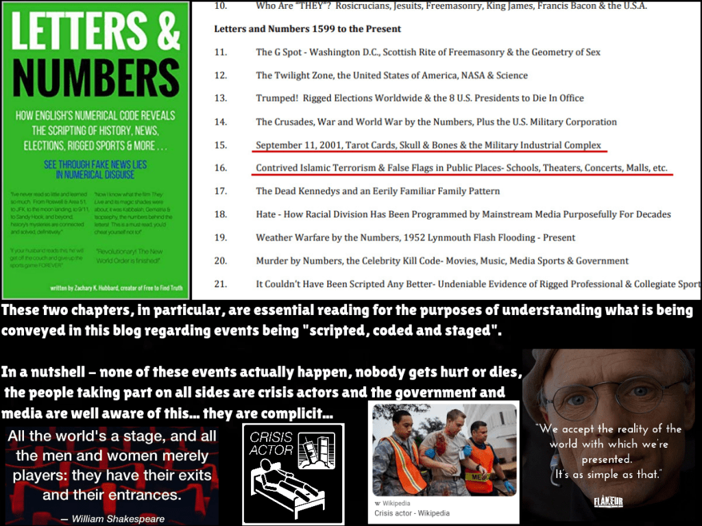 Speaking of the coding, I’d recommend reading the chapters on 9/11 and the fake ‘terrorism’ and ‘shootings’ from Letters and Numbers I linked to in the preface to understand fully that these events are all fake and staged. Only the most wilfully ignorant fluoride guzzling sheep zombie cannot see it when shown.