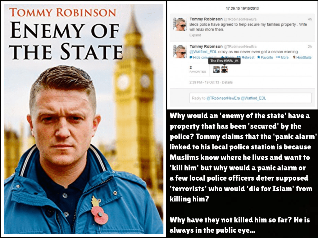 Tommy claims that Muslims who want to kill him know where he lives so why would a panic alarm connected to his local police station make any difference? Are we expected to believe that ‘terrorists’ who would ‘die for Islam’ are scared of a few local plod? Do you really think they couldn’t find him when he is always in the public eye? When he walks around Luton do you really think he doesn’t have undercover Old Bill behind the camera? Use your loaves! The ‘attacks’ on him are all staged and they look like something from WWF (as it was called in my day) – and so do all of his ‘fights’ that are designed to make him seem a ‘hero’ to his supporters and a ‘thug’ to his detractors (which is why they are always in the MSM)…
