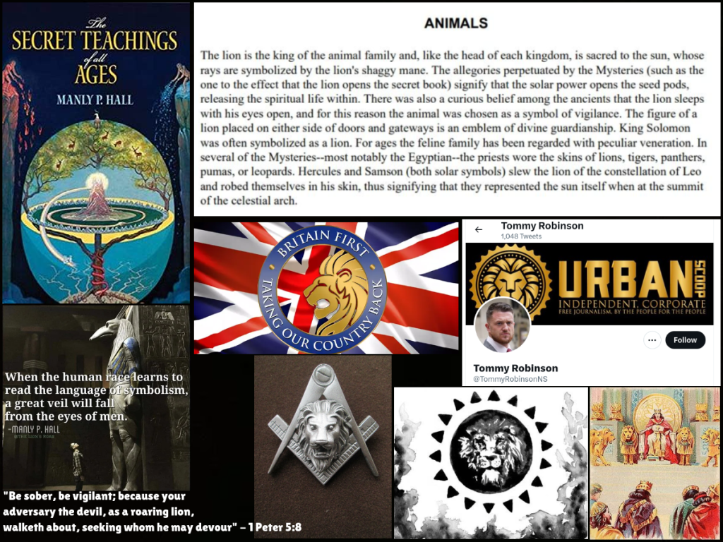 Take a look at the lion symbolism that Tommy’s Urban Scoop and Paul Golding’s Britain First (and many, many other shills and groups) use to show you what they are. The lion is explained from a freemason perspective above, again from freemason Manly P. Hall, and it is a symbol of sun worship. This is why you see so many of these shills using it and using lions as metaphors for their cringeworthy quotes. The lion is also described in The Bible, in 1 Peter 5:8, as a metaphor for the devil – they show you who they serve.