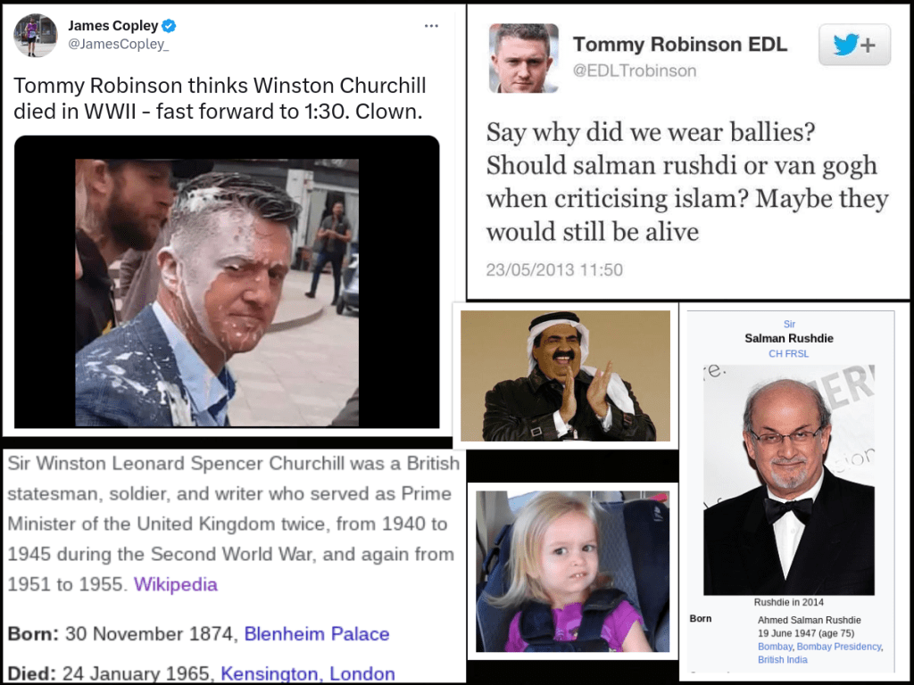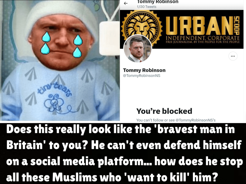 Little Stephen changed his name to ‘Tommy Robinson’ – after a local football hooligan – became an ‘expert’ on Islam by flicking through the Qur’an and then started telling everybody that Muslims are all terrorists and paedophiles like their prophet, Muhammad. He isn’t a racist though because he says he has black friends and had his picture taken with black and brown people – so in your face, lefties!