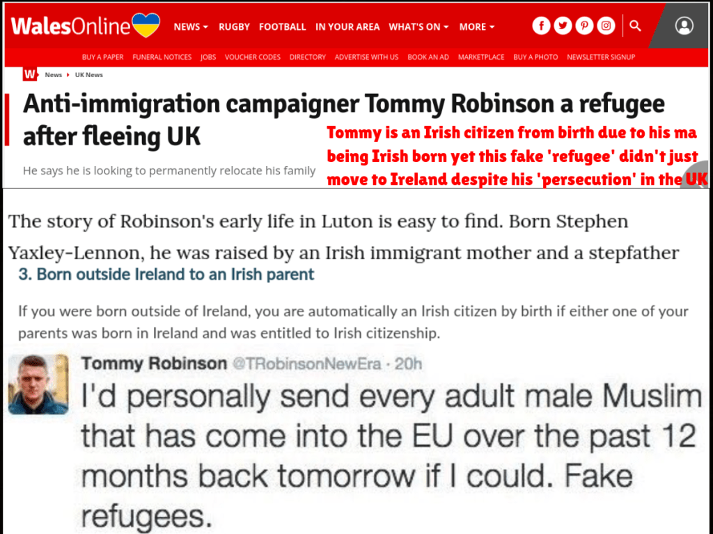 How can Tommy be a ‘patriot’ if he is a Zionist? This literally means that he puts ‘Israel First’ and he even said he’d fight for Israel. Why would a ‘British patriot’ have an Irish passport and use it to fly to Ireland? Why would a ‘patriot’ have appealed to Donald Trump to be allowed to reside in the US?