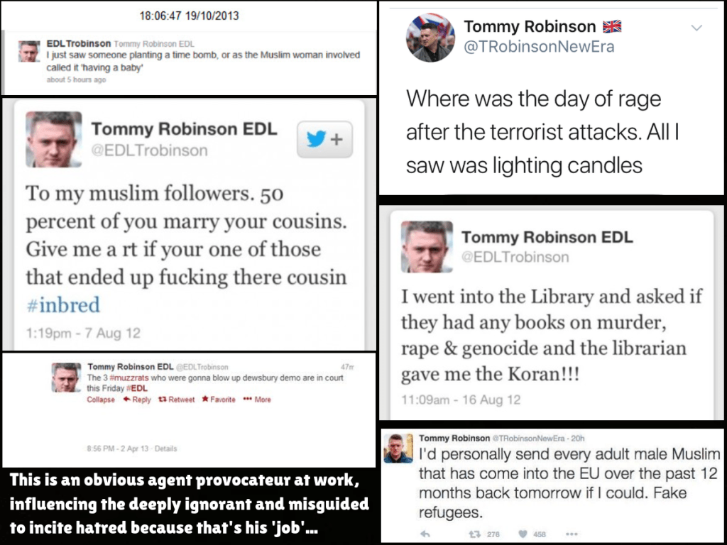 Tommy’s primary agenda is to demonise Islam and to paint Muslims as evil, backwards, intolerant, violent, sexual deviants and ‘terrorists’ who come to the UK to rape women (and children) and to enforce Sharia Law on us and ‘take over our country’. The obviously faked and staged ‘terrorist attacks’ are a primary tool for this as are the ‘grooming gang’ stories that were slowly leaked into the MSM after Tommy had ‘broken’ these stories years beforehand.