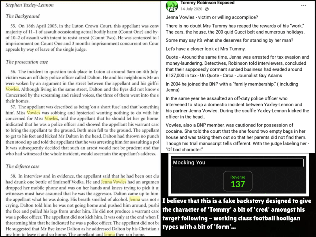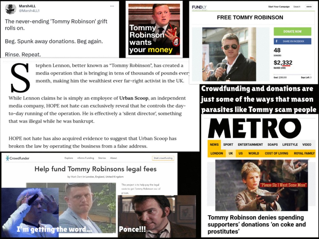 Again, these reports of Tommy’s properties (including inside views from a house he supposedly lives in that were, presumably, taken ‘covertly’) are designed to make people think he is using the donations to feather his own nest when he is working for the state and the donations go to them. This is standard fare with these grifters and we’ll see plenty more examples as we progress through the series…