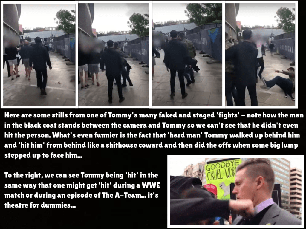 Another thing worth questioning is how someone with Tommy’s supposed criminal record – who is supposedly being ‘silenced’ and is an ‘enemy of the state’ – isn’t banged up for all of the supposed assaults that he allegedly inflicts on people that are reported in the media and ‘caught’ on camera. Given how bent the police force are, it’s an absolute given that he’d be charged and put in prison for them if the state really regarded him as a ‘threat’ and these ‘assaults’ were real. The reason that this doesn’t happen is, as I keep saying, because he is just an actor playing a role for the state to keep you all divided and conquered.