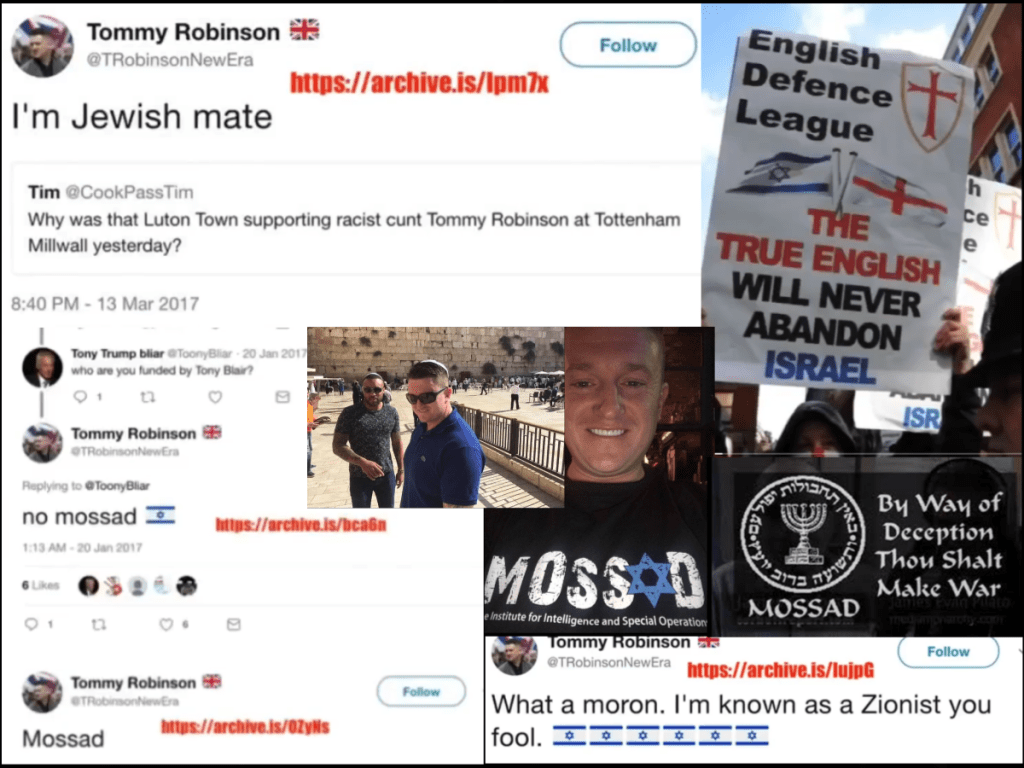 He fully admits that he is a ‘Zionist’ (which means ‘Israel First’ – rather strange for a ‘Christian’ and a ‘patriot’, no?) and, like his fellow shill and chaos agent, Katie Hopkins, he has been pictured wearing Mossad T-shirts. Mossad is the Israeli ‘intelligence’ agency and their motto is “By deception thou shalt do war” and if that isn’t Tommy mocking his followers and showing them what he really is then… well, we’ll see later just how blatantly and flagrantly he does this…