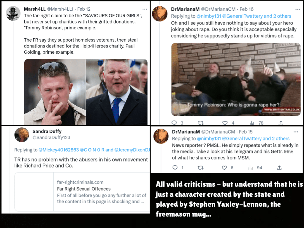 In order for them to do this, they need their own controlled opposition agents, such as Tommy, to spread the narrative they want people who may be influenced by it to hear. This often means the creation of ‘groups’ (such as the EDL) and protests that are then given a negative spin in the media (the same as the ‘anti-lockdown’ ones because they’re all controlled by freemasons working for the state).