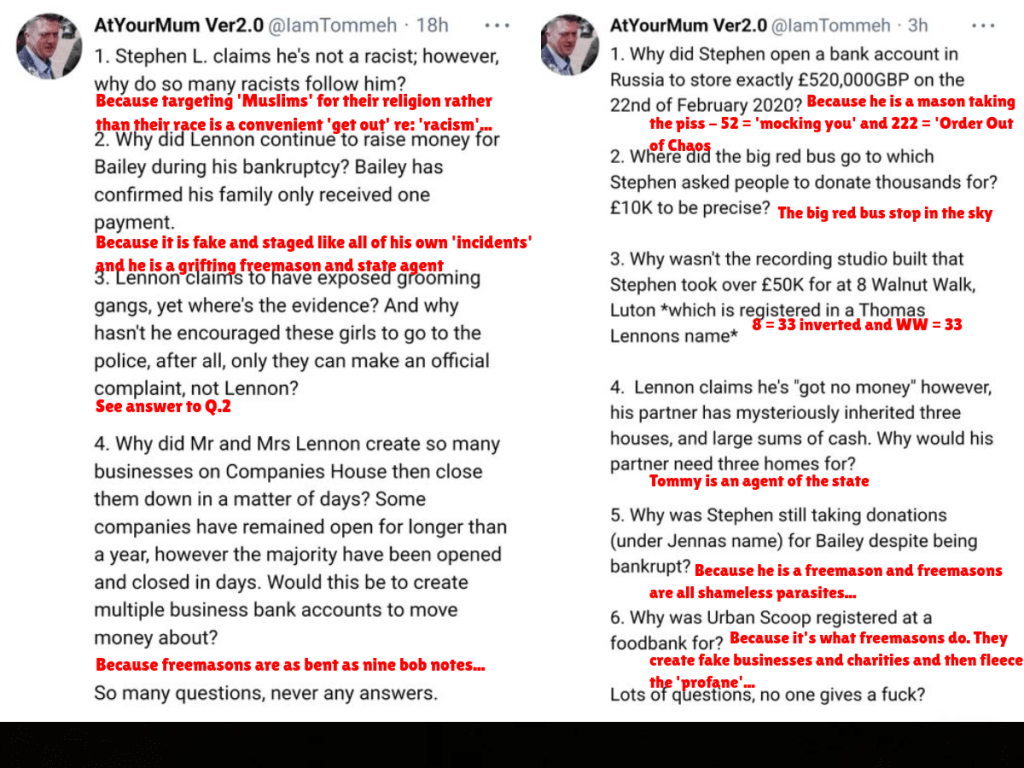 It’s up to you whether you choose to wake up or stay asleep, ranting about a non-existent threat and allowing yourselves to continue to be played by a freemasonic fraud and playing into the hands of the state. It really makes no odds to me, either way. I don’t have ‘merch’ to sell you and I have no interest in ‘donations’ or ‘subscriptions’ as I am not a ponce. I don’t want your personal/contact details and I don’t want to be your best mate. I am simply presenting this information as I cannot abide grifting freemason agents of the state like ‘Tommy’ and the many, many others like him.