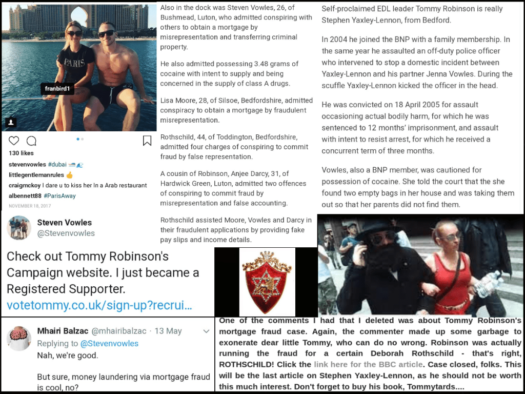 His fake ‘imprisonment’ was for alleged ‘mortgage fraud’, involving someone called Deborah Rothschild, no less, and Tommy’s brother-in-law, Steve Vowles. Tommy’s wife, Jenna, was also involved in a fake story about being caught with cocaine that she ‘found’ and she was part of the manufactured backstory of Tommy being arrested before he became known to the world – he supposedly kicked an undercover police officer in the head during an argument with her.
