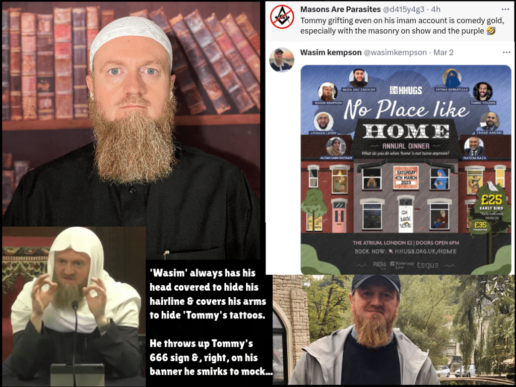 Wasim is supposedly from London yet speaks in a very weird accent – a kind of hybrid of “Standard UK Muslim” and Irish – and yet often reverts into “Tommytalk”. There is a very good example of this here (watch the mannerisms and pay very close attention to the voice he is putting on). He is also never seen without his head covered (to hide Tommy’s hairline) and always covers his arms (to hide Tommy’s tattoos). He also grifts from his account like Tommy – and this is a huge red flag for freemasons – and throws up the ‘666’ handsign like Tommy does.