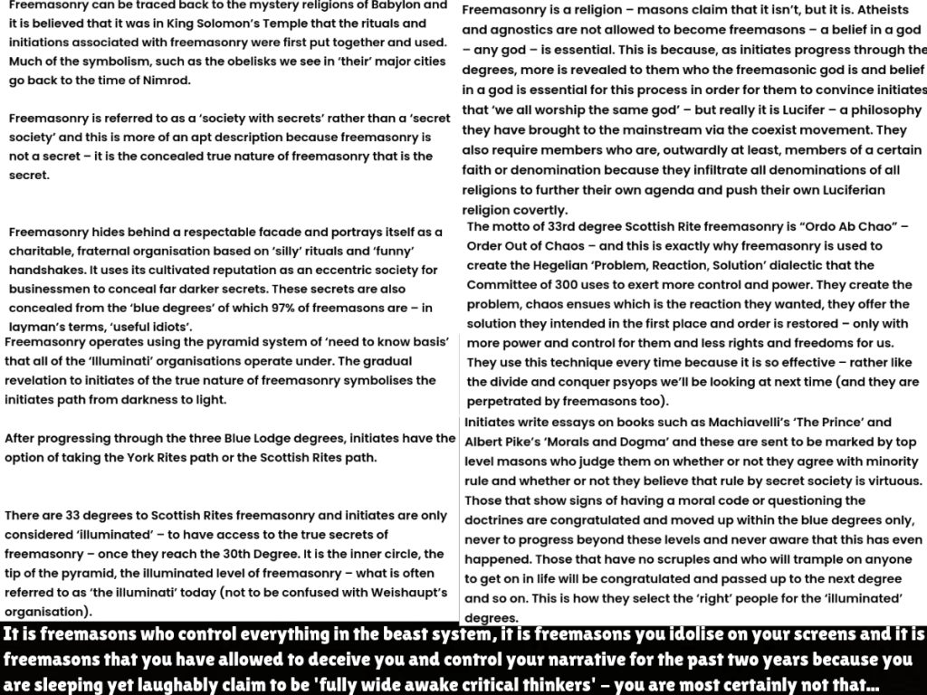 Most people don’t really know much about freemasonry – especially the ‘blue degree freemasons’ who are kept in the dark and used as ‘useful idiots’ by actual Luciferian freemasons – but just understand that freemasons are all born liars and deceivers (it’s their Luciferian religion) and nothing they say can be trusted at all.